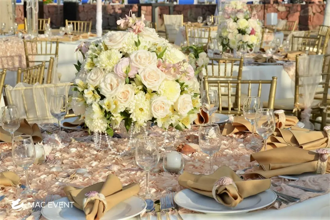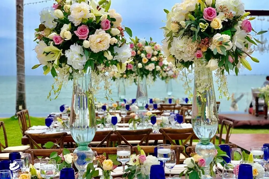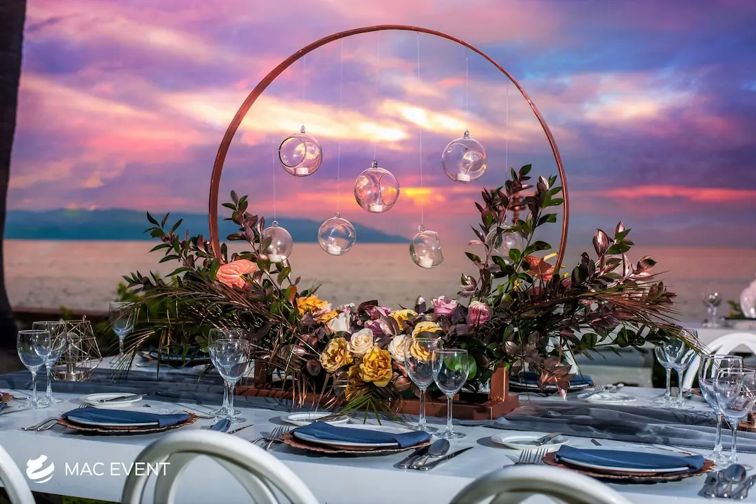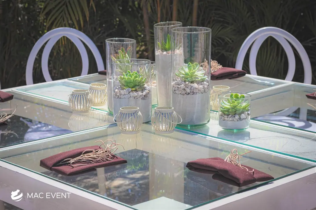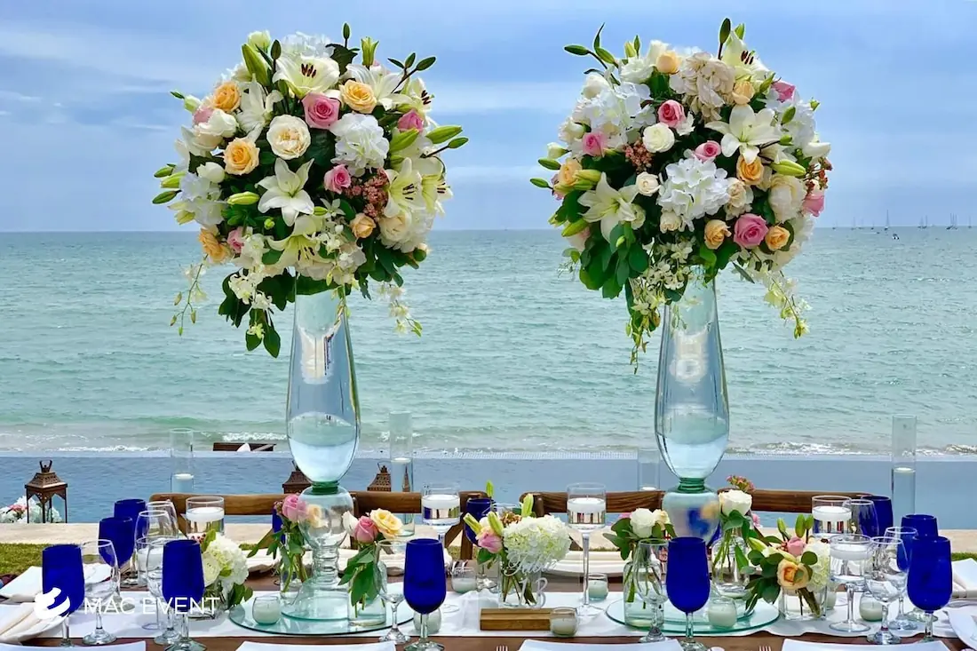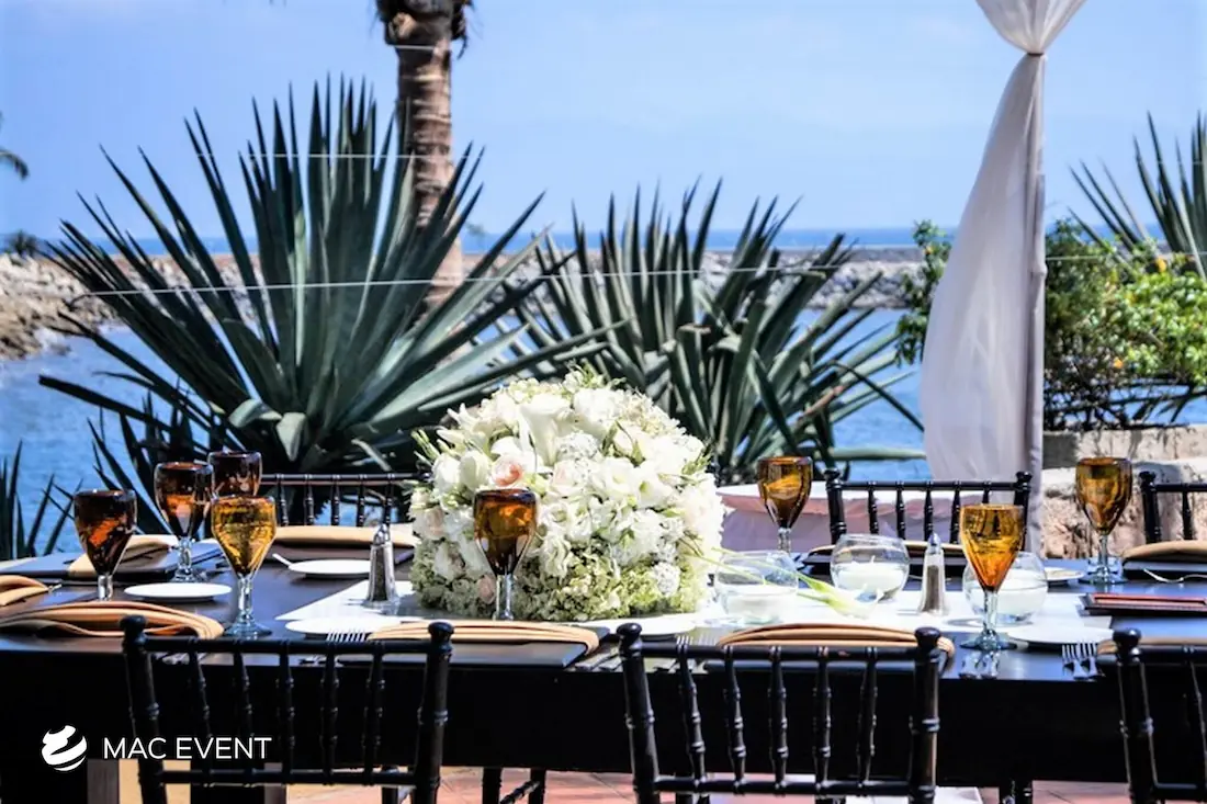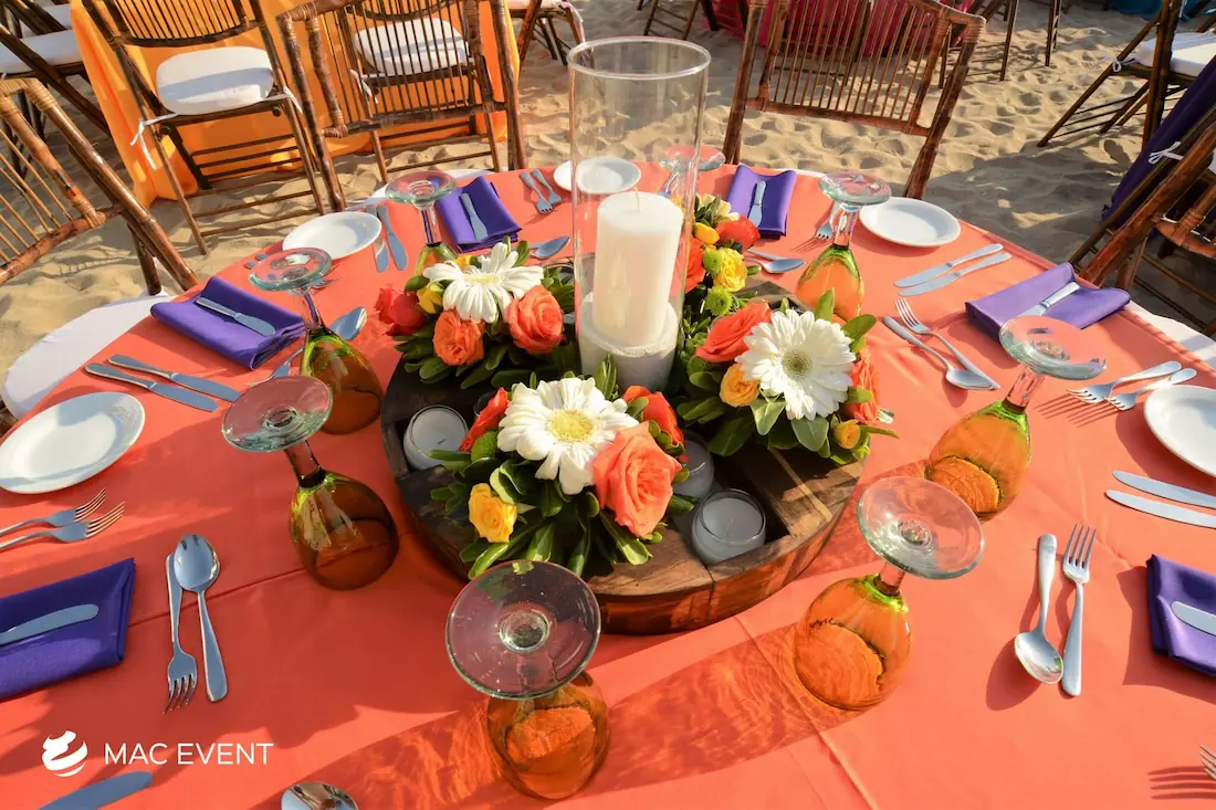 The banquet table centerpiece adds elegance and harmony to long table setups at weddings, parties, and corporate events in Bucerias. Designed to complement extended dining arrangements, this event décor rental enhances the flow and visual balance of your space. Whether styled with lush greenery, candles, or floral arrangements, the banquet table centerpiece creates a warm and sophisticated atmosphere that encourages conversation and connection. Renting banquet table centerpieces in Bucerias ensures a coordinated and polished presentation that perfectly matches your event theme. For a refined and inviting dining experience, this centerpiece is an ideal finishing touch.