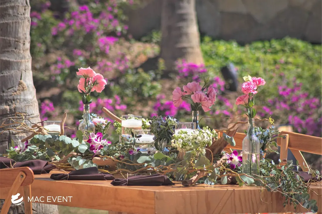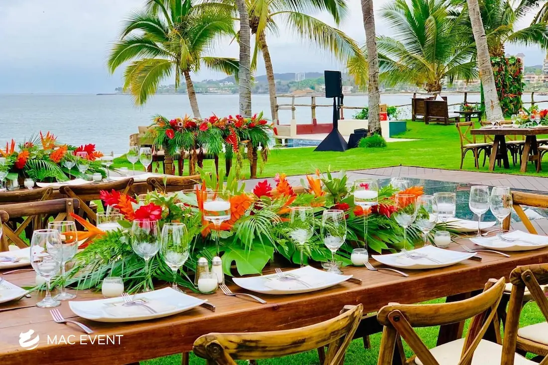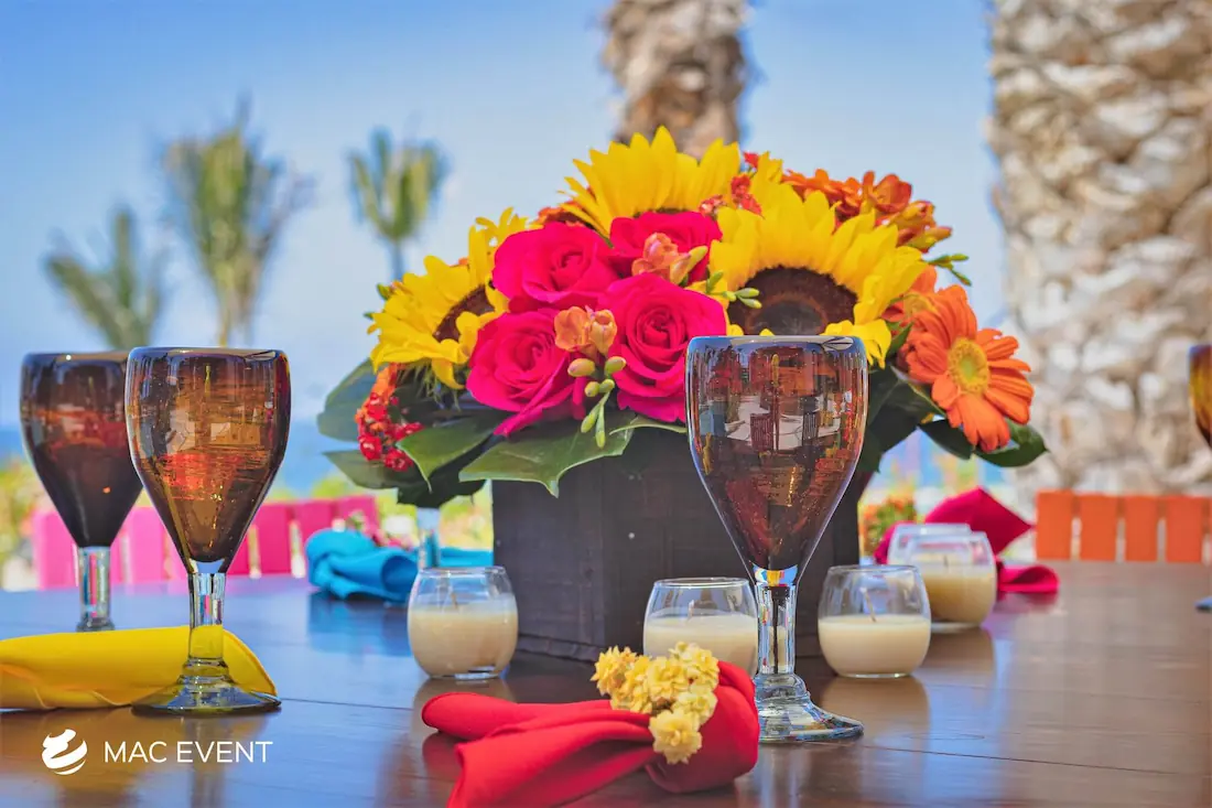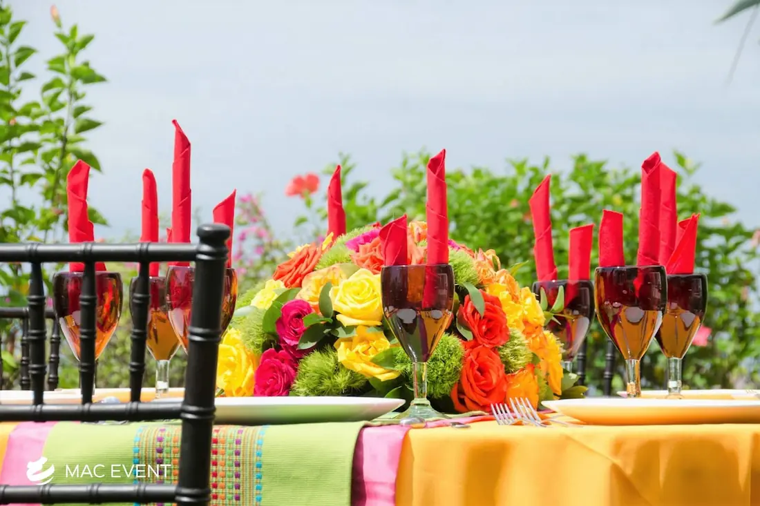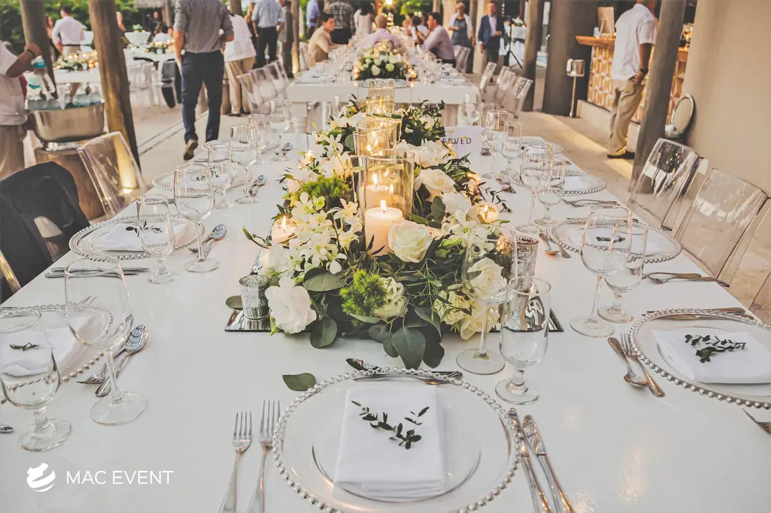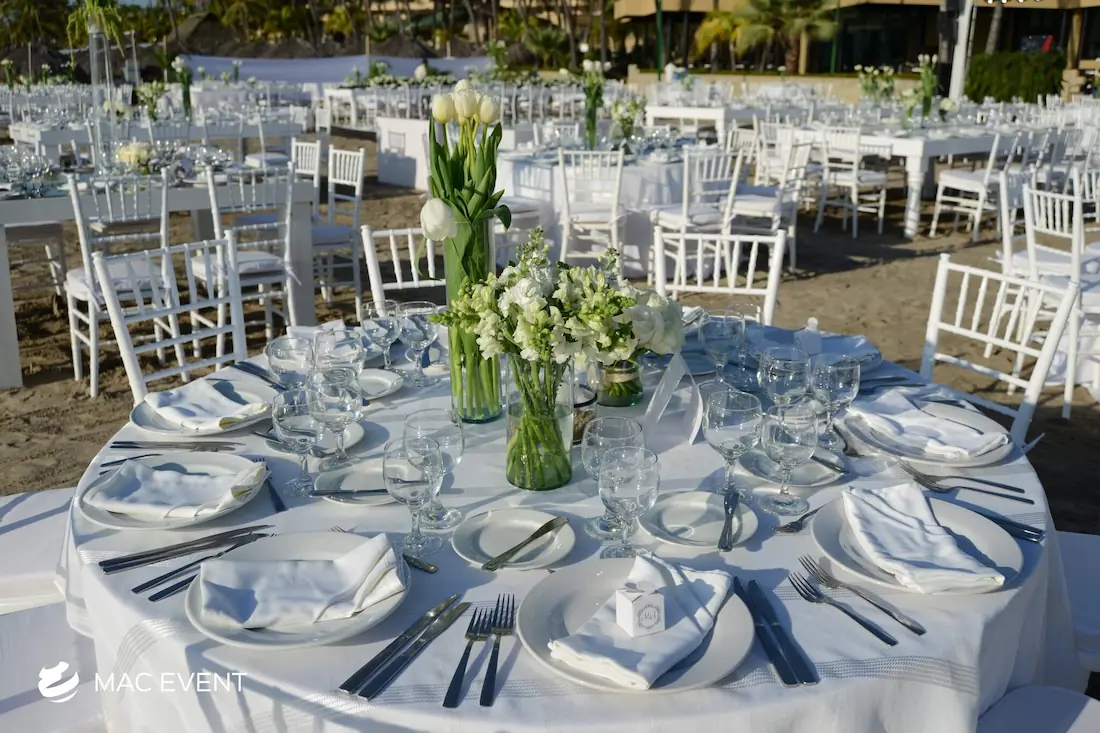 The banquet table centerpiece adds elegance and harmony to long table setups at weddings, parties, and corporate events in Bucerias. Designed to complement extended dining arrangements, this event décor rental enhances the flow and visual balance of your space. Whether styled with lush greenery, candles, or floral arrangements, the banquet table centerpiece creates a warm and sophisticated atmosphere that encourages conversation and connection. Renting banquet table centerpieces in Bucerias ensures a coordinated and polished presentation that perfectly matches your event theme. For a refined and inviting dining experience, this centerpiece is an ideal finishing touch.