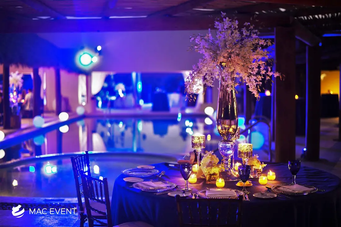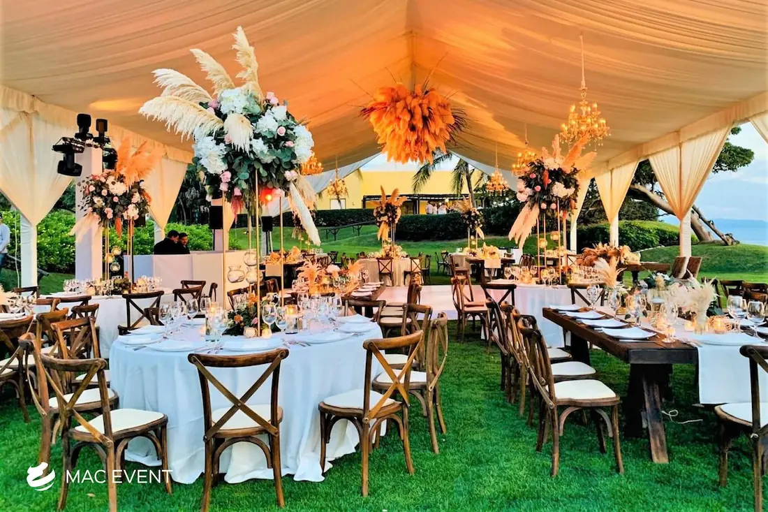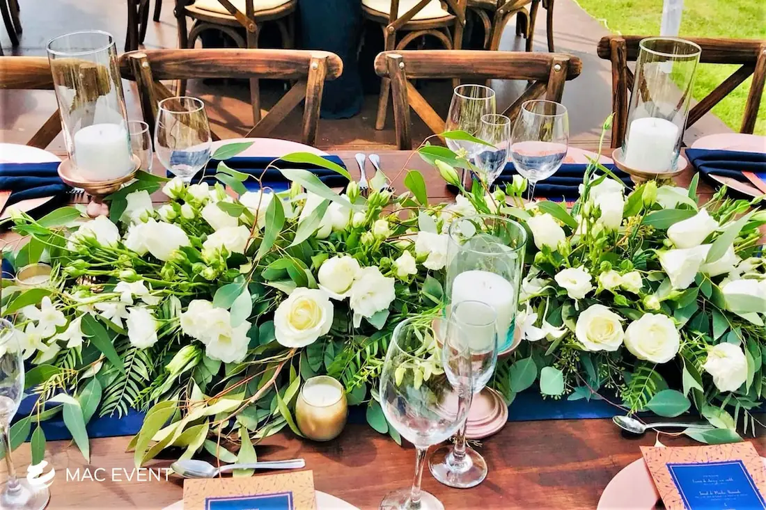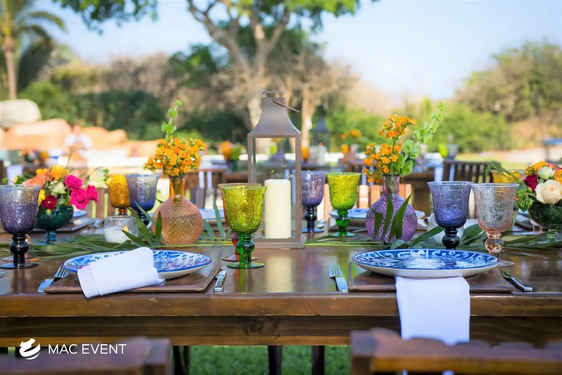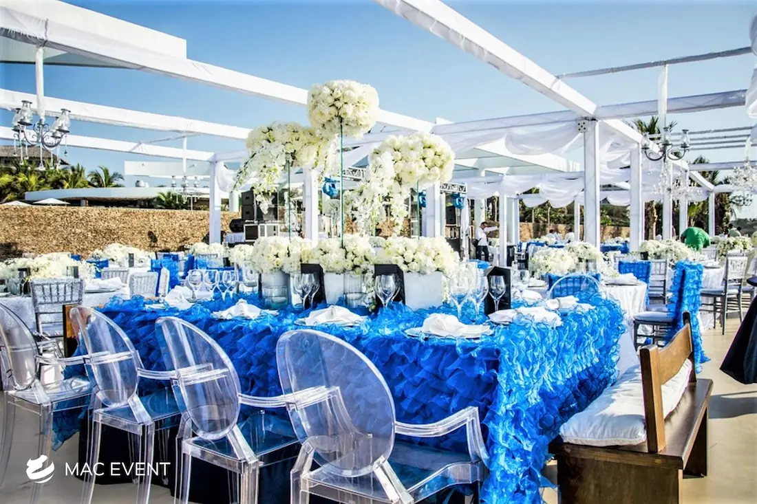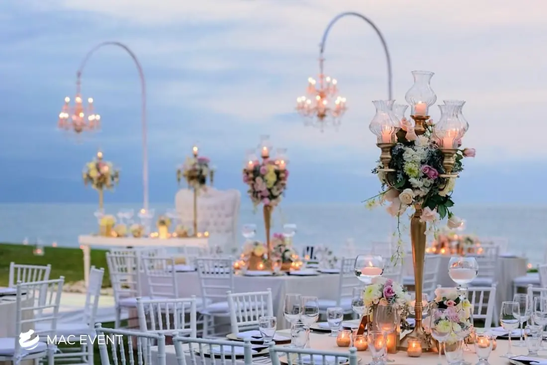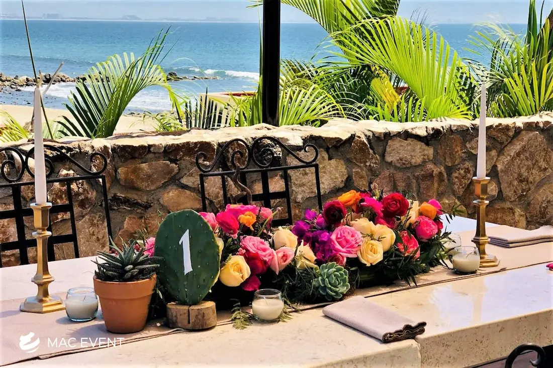 The banquet table centerpiece adds elegance and harmony to long table setups at weddings, parties, and corporate events in Bucerias. Designed to complement extended dining arrangements, this event décor rental enhances the flow and visual balance of your space. Whether styled with lush greenery, candles, or floral arrangements, the banquet table centerpiece creates a warm and sophisticated atmosphere that encourages conversation and connection. Renting banquet table centerpieces in Bucerias ensures a coordinated and polished presentation that perfectly matches your event theme. For a refined and inviting dining experience, this centerpiece is an ideal finishing touch.