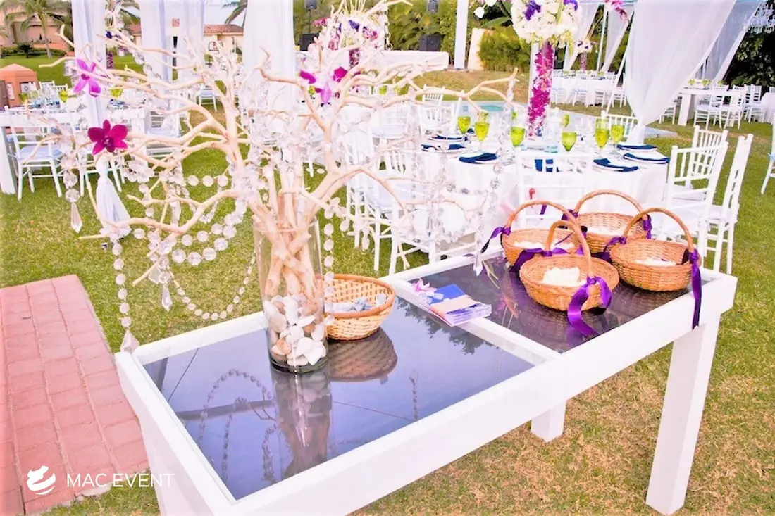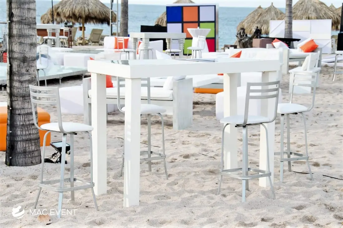 The wooden glass cocktail table combines natural beauty with modern elegance, making it a stylish choice for weddings, parties, and corporate events in Bucerias. Its wooden base adds warmth and character, while the glass top gives a sleek, refined finish that complements any décor. This event table rental works perfectly for cocktail hours, lounge areas, or receptions where you want to create a polished yet inviting atmosphere. Renting wooden glass cocktail tables in Bucerias ensures a cohesive setup that blends sophistication with comfort. For an event that stands out with style and balance, this table is an ideal addition.